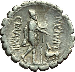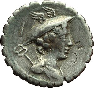 Roman Republican. C. Mamilius Limetanus. Denarius serratus, ca 82. Obv.: Draped bust of Mercury right, wearing winged petasus; caduceus over left shoulder and behind, I. Rev.: C·MAMIL – LIMETAN Ulysses standing right, holding staff and extending his right hand to his dog Argus. B. Mamilia 6. Syd. 741. Cr. 362/1. AG. g. 3.93 mm. 20.00 Two countermarks on Obv. VF. Repubblica Romana. C. Mamilius Limetanus. Denario serrato, ca 82. D/ Busto drappeggiato di Mercurio a destra, con caduceo sulla spalla sinistra. Dietro, I. R/ C·MAMIL – LIMETAN. Ulisse stante a destra, tiene un bastone ed estende la mano destra al suo cane Argo. B. Mamilia 6. Syd. 741. Cr. 362/1. AG. g. 3.93 mm. 20.00 Due contromarche al D/ BB.