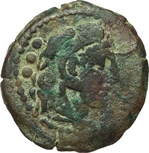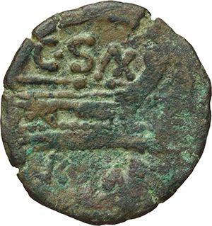 Roman Republican. 'C.SAX' series. Quadrans, Central Italy ca 169-158. Obv.: Head of Hercules right, wearing lion skin, behind three pellets. Rev.: Prow right; above C.SAX, before three pellets. Below, ROMA. B. Clovia 3. Syd 361c. Cr. 180/4. AE. g. 5.58 mm. 20.00 NC. VF. Repubblica Romana. Serie 'C.SAX'. Quadrante, Italia centrale ca 169-158. D/ Testa di Ercole a destra con pelle di leone, dietro tre globetti. R/ Prua a destra; sopra C.SAX, davanti tre globetti. Sotto, ROMA. B. Clovia 3. Syd 361c. Cr. 180/4. AE. g. 5.58 mm. 20.00 NC. BB.