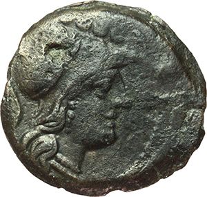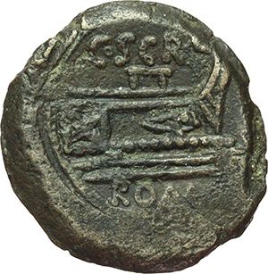 Roman Republican. C. Scribonius. Triens, ca 154. Obv.: Helmeted head of Minerva right, behind four pellets. Rev.: Prow right; above C.SCR, before four pellets. Below, ROMA. B. Scribonia 4. Syd. 381b. Cr. 201/4. AE. g. 7.26 mm. 22.00 R. Good VF. Repubblica Romana. C. Scribonius. Triente, ca 154. D/ Testa di Minerva elmata a destra, dietro quattro globetti. R/ Prua a destra; sopra C.SCR, davanti quattro globetti. Sotto, ROMA. B. Scribonia 4. Syd. 381b. Cr. 201/4. AE. g. 7.26 mm. 22.00 R. BB+.