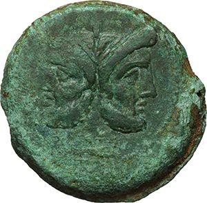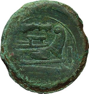 Roman Republican. 'Club' series. As, South East Italy circa 208. Obv.: Laureate head of Janus; above, mark of value I. Rev.: Prow right; above, club set horizontally to right and before, mark of value. In exergue, ROMA. Syd. 213. Cr. 89/3a. AE. g. 49.36 mm. 39.00 VF. Repubblica Romana. Serie 'clava'. Asse, Italia sud orientale ca 209-208. D/ Testa laureata di Giano, sopra segno di valore I. R/ Prua a destra; sopra segno di valore, davanti delfino che nuota verso il basso. Sotto, ROMA. Syd. 213. Cr. 89/3a. AE. g. 49.36 mm. 39.00 BB.