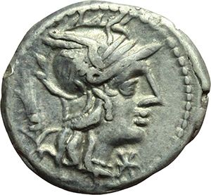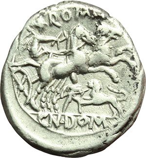 Roman Republican. Cn. Domitius Calvinus. Denarius, ca 128. Obv.: Helmeted head of Roma right; below chin, X and behind, stalk of corn. Rev.: Victory in prancing biga right, above, ROMA. Below horses, man fighting lion. In exergue, CN·DOM. B. Domitia 14. Syd. 514. Cr. 261/1. AG. g. 3.89 mm. 19.00 Good VF. Repubblica Romana. Cn. Domitius Calvinus. Denario, ca 128. D/ Testa elmata di Roma a destra; sotto il mento X, dietro spiga. R/ Vittoria su quadriga al galoppo a destra; sopra ROMA, sotto un uomo combatte contro un leone. In esergo, CN·DOM. B. Domitia 14. Syd. 514. Cr. 261/1. AG. g. 3.89 mm. 19.00 BB+.