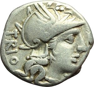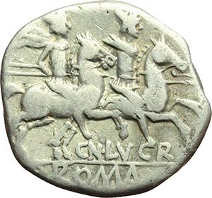 Roman Republican. Cn. Lucretius Trio. Denarius, ca 136. Obv.: Helmeted head of Roma right; below chin, X and behind, TRIO. Rev.: The Dioscuri galloping right, below, CN·LVCR. In exergue, ROMA. B. Lucretia 1. Syd. 450. Cr. 237/1a. AG. g. 3.77 mm. 16.50 About VF/F+. Repubblica Romana. Cn. Lucretius Trio. Denario, ca 136. D/ Testa elmata di Roma a destra; sotto il mento X, dietro TRIO. R/ I Dioscuri al galoppo a destra; sotto, CN·LVCR. In esergo, ROMA. B. Lucretia 1. Syd. 450. Cr. 237/1a. AG. g. 3.77 mm. 16.50 qBB/MB+.