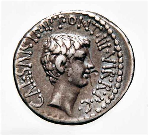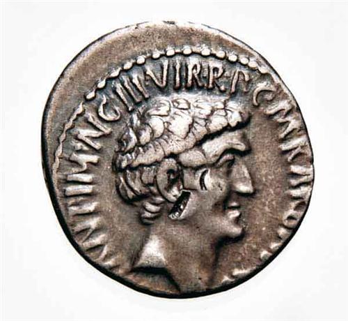 Monete Romane Repubblicane - Denaro ai nomi di Marco Antonio, Marcus Barbatius e Caius Caesar (Ottaviano di Augusto) databile al 41 a.C. - Zecca itinerante al seguito di Marco Antonio - Metallo: Ag - Diritto: effigie di Marco Antonio a destra - Rovescio: effigie di Ottaviano (il futuro Augusto) - Punzonatura al diritto e al rovescio