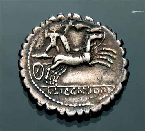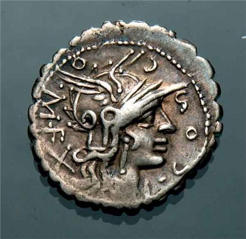 Roman Republican Coins - Ag - Denaro "serrato" al nome di più magistrati monetari databile al 118 a.C. - Zecca: Narbo - Diritto: effigie elmata della dea Roma a destra - Rovescio: guerriero nudo su biga al galoppo verso destra - gr. 3,86 -