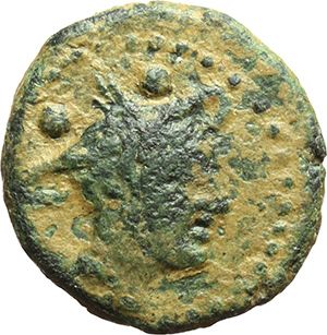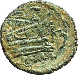 Roman Republican. 'Corn-ear and KA' series. Sextans, Sicily ca 207-206. Obv.: Head of Mercury right, above two pellets. Rev.: Prow right, above corn-ear, before KA. Below, ROMA. Syd. 310d. Cr. 69/6a. AE. g. 5.32 mm. 21.00 VF. Nice green patina. Repubblica Romana. Serie 'spiga di grano e KA'. Sestante, Sicilia ca 207-206. D/ Testa di Mercurio a destra, sopra due globetti. R/ Prua a destra; sopra spiga di grano, davanti KA. Sotto, ROMA. Syd. 310d. Cr. 69/6a. AE. g. 5.32 mm. 21.00 BB. Bella patina verde.