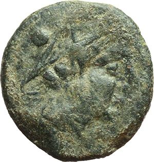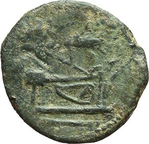 Roman Republican. 'Corn-ear and KA' series. Sextans, Sicily ca 207-206. Obv.: Head of Mercury right, above two pellets. Rev.: Prow right, above corn-ear, before K A. Below, ROMA. Syd. 310d. Cr. 69/6a. AE. g. 6.17 mm. 20.00 About VF. Traces of over-striking. Repubblica Romana. Serie 'spiga di grano e KA'. Sestante, Sicilia ca 207-206. D/ Testa di Mercurio a destra, sopra due globetti. R/ Prua a destra; sopra spiga di grano, davanti KA. Sotto, ROMA. Syd. 310d. Cr. 69/6a. AE. g. 6.17 mm. 20.00 qBB. Tracce di ribattitura.
