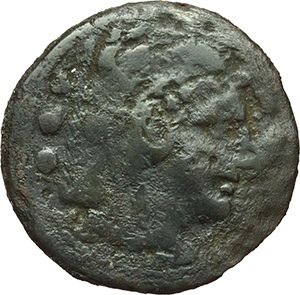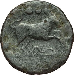Roman Republican. Corn-ear series. Quadrans, Sicily ca 214-212. Obv.: Head of Hercules right, behind three pellets. Rev.: Bull charging right; above three pellets, below snake. In exergue, ROMA. Syd. p. 10, note *. Cr. -. Russo, Essays Hersh, 30. AE. g. 14.83 mm. 30.00 RR. About VF. Rare variety without corn-ear. Repubblica Romana. Serie 'spiga di grano'. Quadrante, Sicilia ca 214-212. D/ Testa di Ercole a destra, dietro tre globetti. R/ Toro cozzante a destra; sopra tre globetti, sotto serpente. In esergo, ROMA. Syd. p. 10, note *. Cr. -. Russo, Essays Hersh, 30. AE. g. 14.83 mm. 30.00 RR. qBB. Rara variante senza spiga di grano.