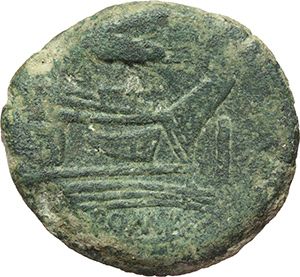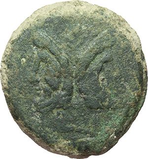 Roman Republican. 'Corn-ear (third)' series. As, Sicily ca 190. Obv.: Laureate head of Janus, above mark of value I. Rev.: Prow right; above corn-ear, before mark of value. Below, ROMA. Syd. 195. Cr. 72/11. AE. g. 32.08 mm. 32.20 R. VF. Repubblica Romana. Serie 'spiga di grano (terza)'. Asse, Sicilia ca 190. D/ Testa di Giano laureata, sopra segno di valore I. R/ Prua a destra; sopra spiga di grano, davanti segno di valore. Sotto, ROMA. Syd. 195. Cr. 72/11. AE. g. 32.08 mm. 32.20 R. BB.