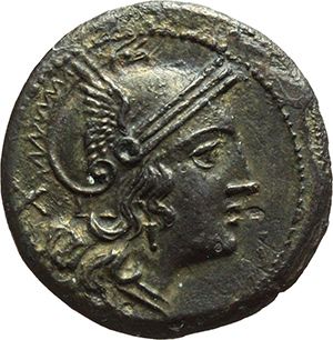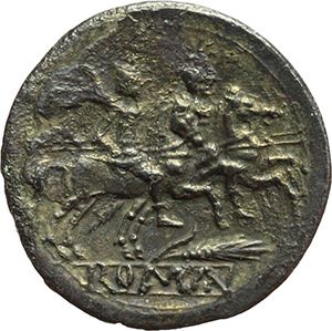 Roman Republican. 'Corn-ear (third)' series. Denarius, Sicily ca 211-210. Obv.: Helmeted head of Roma right; behind X. Rev.: Dioscuri galloping right; below corn-ear and ROMA in linear frame. Syd. 193. Cr. 72/3. AG. g. 4.37 mm. 19.80 R. VF. Small corrosions. Repubblica Romana. Serie 'spiga di grano (terza)'. Denario, Sicilia ca 211-210. D/ Testa elmata di Roma a destra; dietro X. R/ Dioscuri al galoppo a destra; sotto spiga di grano e ROMA. Syd. 193. Cr. 72/3. AG. g. 4.37 mm. 19.80 R. BB. Piccole corrosioni.