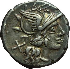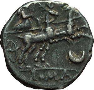 Roman Republican. 'Crescent' series. Denarius, ca 143. Obv.: Helmeted head of Roma right; behind, X. Rev.: Diana in prancing biga of stags right, holding torch and reins; below, crescent and ROMA. Syd. 438. Cr. 222/1. AG. g. 3.76 mm. 17.80 Good VF. Repubblica Romana. Serie 'crescente'. Denario, ca 143. D/ Testa elmata di Roma a destra; dietro X. R/ Diana su biga trainata da cervi a destra tiene torcia e redini; sotto crescente e ROMA. Syd. 438. Cr. 222/1. AG. g. 3.76 mm. 17.80 BB+.