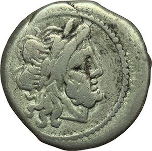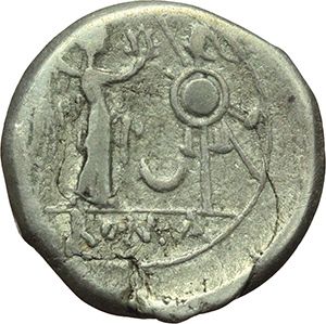 Roman Republican. 'Crescent' series. Victoriatus, ca 207. Obv.: Laureate head of Jupiter right. Rev.: Victory crowning trophy; in centre field, crescent. In exergue, ROMA. Syd. 220. Cr. 57/1. AG. g. 3.05 mm. 17.00 About VF. Repubblica Romana. Serie 'crescente'. Vittoriato, ca 207. D/ Testa laureata di Giove a destra. R/ Vittoria incorona un trofeo; nel campo al centro, crescente. In esergo, ROMA. Syd. 220. Cr. 57/1. AG. g. 3.05 mm. 17.00 qBB.