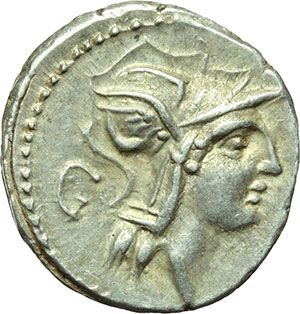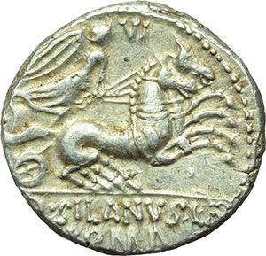 Roman Republican. D. Silanus L.f. Denarius, 91 BC. Obv.: Head of Roma right. G behind. Rev.: Victory driving biga right. VI above. In exergue: D. SILANVS L.F/ROMA. Cr.337/3. B.(Iunia) 15. AG. g. 4.00 mm. 17.50 EF. Repubblica Romana. D. Silanus L.f. Denario, 91 a.C. D/ Testa di Roma a destra. Dietro, G. R/ Vittoria in biga a destra. Sopra, VI. In esergo: D. SILANVS L.F/ROMA. Cr.337/3. B.(Iunia) 15. AG. g. 4.00 mm. 17.50 SPL.