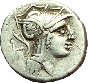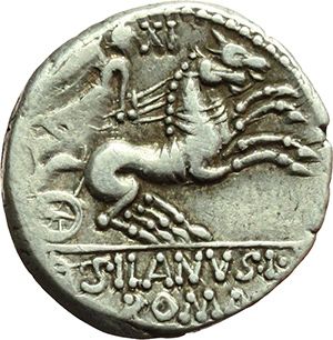 Roman Republican. D. Silanus L.f. Denarius, ca 91. Obv.: Helmeted head of Rome right; behind X. Rev.: Victory driving galloping biga right; above, XI. In exergue, D. SILANVS L. F/ROMA in two lines. B. Junia 15. Syd. 646. Cr. 337/3. AG. g. 4.05 mm. 18.50 VF. Repubblica Romana. D. Silanus L.f. Denario, ca 91. D/ Testa elmata di Roma a destra; dietro X. R/ Vittoria su biga al galoppo a destra; sopra XXII. In esergo su due linee D. SILANVS L. F/ROMA. B. Junia 15. Syd. 646. Cr. 337/3. AG. g. 4.05 mm. 18.50 BB.