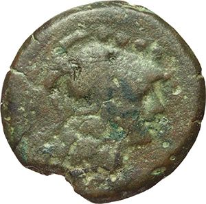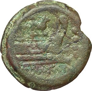 Roman Republican. 'Dog' series. Triens, ca 206-195. Obv.: Helmeted head of Minerva right, above four pellets. Rev.: Prow right; above dog, before four pellets. Below, ROMA. Syd. 251b. Cr. 122/5. AE. g. 13.07 mm. 25.50 R. VF. Repubblica Romana. Serie 'cane'. Triente,ca 206-195. D/ Testa di Minerva elmata a destra, sopra quattro globetti. R/ Prua a destra; sopra cane, davanti quattro globetti. Sotto, ROMA. Syd. 251b. Cr. 122/5. AE. g. 13.07 mm. 25.50 R. BB.