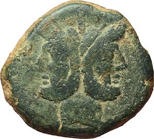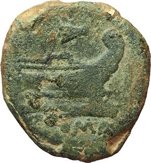Roman Republican. 'Fly' series. As, ca 179-170. Obv.: Laureate head of Janus; above mark of value I. Rev.: Prow right; above fly, before mark of value and below, ROMA. Syd. 324. Cr. 159/3. AE. g. 33.86 mm. 35.00 R. VF. Repubblica Romana. Serie 'mosca'. Asse, ca 179-170. D/ Testa di Giano laureata; sopra segno di valore I. R/ Prua a destra; sopra mosca, davanti segno di valore e sotto, ROMA. Syd. 324. Cr. 159/3. AE. g. 33.86 mm. 35.00 R. BB.