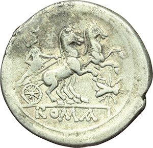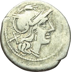 Roman Republican. 'Fly' series. Denarius, ca 179-170. Obv.: Helmeted head of Roma right; behind X. Rev.: Luna in prancing biga right; below, fly and ROMA. Syd. 322. Cr. 159/2. AG. g. 3.75 mm. 19.50 About VF/VF. Repubblica Romana. Serie 'mosca'. Denario, ca 179-170. D/ Testa elmata di Roma a destra; dietro X. R/ Luna su quadriga al galoppo a destra; sotto mosca e ROMA. Syd. 322. Cr. 159/2. AG. g. 3.75 mm. 19.50 qBB/BB.