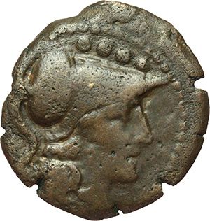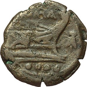 Roman Republican. 'Fly' series. Triens, 179-170. Obv.: Helmeted head of Minerva right, behind four pellets. Rev.: Prow right; above ROMA; before, fly. Below, four pellets. Syd 342b. Cr. 159/5. AE. g. 7.14 mm. 21.50 R. VF. Nice brown patina. Repubblica Romana. Serie 'mosca'. Triente, ca 179-170. D/ Testa di Minerva elmata a destra, dietro quattro globetti. R/ Prua a destra; sopra ROMA; davanti, mosca. Sotto, quattro globetti. Syd 342b. Cr. 159/5. AE. g. 7.14 mm. 21.50 R. BB. Bella patina marrone.