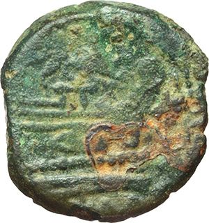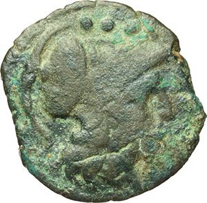 Roman Republican. 'Gryphon' series. Triens, ca 169-158. Obv.: Helmeted head of Minerva right, above four pellets. Rev.: Prow right; above Victory and spearhead, before four pellets. Below, ROMA. Syd. 284b. Cr. 182/4. AE. g. 6.70 mm. 20.00 RR. VF. Repubblica Romana. Serie 'grifone'. Triente,ca 169-158. D/ Testa di Minerva elmata a destra, sopra quattro globetti. R/ Prua a destra; sopra Vittoria e punta di lancia, davanti quattro globetti. Sotto, ROMA. Syd. 284b. Cr. 182/4. AE. g. 6.70 mm. 20.00 RR. BB.