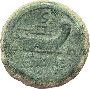 Roman Republican. 'H' series. Semis, South East Italy ca 211-210. Obv.: Laureate head of Saturn right, behid S. Rev.: Prow right; above S, before H. Below, ROMA. Syd. 175a. Cr. 85/3. AE. g. 19.40 mm. 28.50 NC. Good VF. Repubblica Romana. Serie 'H'. Semisse, Italia sud-orientale ca 211-210. D/ Testa di Saturno laureata a destra, dietro S. R/ Prua a destra; sopra S, davanti H. Sotto, ROMA. Syd. 175a. Cr. 85/3. AE. g. 19.40 mm. 28.50 NC. BB+.