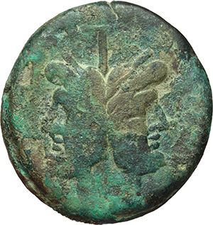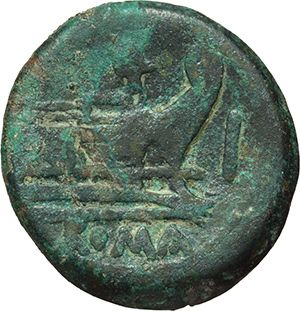 Roman Republican. 'Helmet' series. As, ca 206-195. Obv.: Laureate head of Janus, above mark of value I. Rev.: Prow right; above helmet, before mark of value. Below, ROMA. Syd. 272. Cr. 118/1. AE. g. 35.55 mm. 32.80 NC. Good VF. Repubblica Romana. Serie 'elmetto'. Asse, ca 206-195. D/ Testa di Giano laureata, sopra segno di valore I. R/ Prua a destra; sopra elmo, davanti segno di valore. Sotto, ROMA. Syd. 272. Cr. 118/1. AE. g. 35.55 mm. 32.80 NC. BB+.
