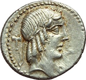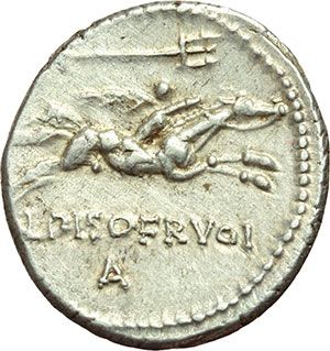 Roman Republican. L. Calpurnius Piso Frugi. Denarius, 90 BC. Obv.: Laureate head of Apollo right. Axe behind. O below chin. Rev.: Nude horseman ridign right, holding palm frond. Trident above. Below: L PISO FRVGI/A. Cr. 340/1. B.11. Banti 120/14. AG. g. 3.74 mm. 18.00 EF. Repubblica Romana. L. Calpurnius Piso Frugi. Denario, 90 a.C. D/ Testa laureata di Apollo a destra. Dietro, simbolo ascia. Sotto il mento, O. R/ Cavaliere nudo con ramo di palma su cavallo al galoppo a destra. Sopra, tridente. Sotto, L PISO FRVGI/A. Cr. 340/1. B.11. Banti 120/14. AG. g. 3.74 mm. 18.00 SPL.