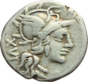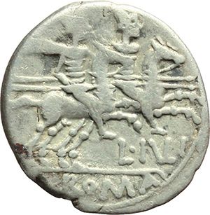 Roman Republican. L. Iuli. Denarius, ca 141. Obv.: Helmeted head of Roma right; behind, XVI. Rev.: The Dioscuri galloping right; below horses, L·IVLI and ROMA. B. Julia 1. Syd. 443. Cr. 224/1. AG. g. 3.75 mm. 19.00 About VF. Repubblica Romana. L. Iuli. Denario, ca 141. D/ Testa elmata di Roma a destra; dietro XVI. R/ I Dioscuri al galoppo a destra; sotto i cavalli, L·IVLI e ROMA. B. Julia 1. Syd. 443. Cr. 224/1. AG. g. 3.75 mm. 19.00 qBB.