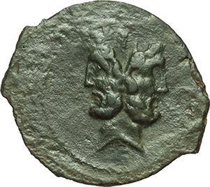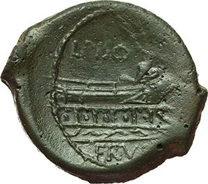 Roman Republican. L. Piso Frugi. As, ca 90. Obv.: Laureate head of Janus, above mark of value I. Rev.: Prow right on which stands Victory above L.PISO, below, L.FRVGI. B. Calpurnia 18. Syd 677. Cr. 340/4. AE. g. 10.96 mm. 30.00 Good VF. Repubblica Romana. L. Piso Frugi. Asse, ca 90. D/ Testa di Giano laureata, sopra segno di valore I. R/ Prua a destra, su cui si appoggia una Vittoria; sopra L.PISO, sotto, L.FRVGI. B. Calpurnia 18. Syd 677. Cr. 340/4. AE. g. 10.96 mm. 30.00 BB+.