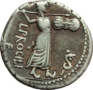 Roman Republican. L. Procilius. Denarius, ca 80. Obv.: Laureate head of Jupiter right; behind, S·C. Rev.: Juno Sospita standing right, holding shield and hurling spear; at her feet, snake. Behind, L PORICILI/F. B. Procilia 1. Syd. 771. Cr. 379/1. AG. g. 3.97 mm. 17.50 VF/about VF. Repubblica Romana. L. Procilius. Denario, ca 80. D/ Testa laureata di Giove a destra; dietro S.C. R/ Juno Sospita a destra; tiene uno scudo e brandisce una lancia; ai suoi piedi un serpente. Dietro, L PORICILI/F. B. Procilia 1. Syd. 771. Cr. 379/1. AG. g. 3.97 mm. 17.50 BB/qBB.