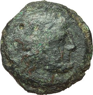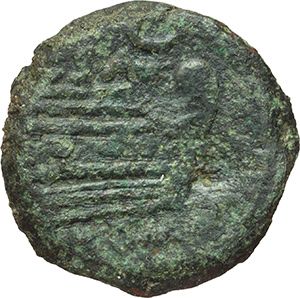 Roman Republican. L. Saufeius. Semis, ca 152. Obv.: Laureate head of Saturn right, behind S. Rev.: Prow right; above L.SAVF/crescente, before S. Below ROMA. B. Saufeia 3. Syd 385a. Cr. 204/3. AE. g. 13.40 mm. 25.00 About VF. Repubblica Romana. L. Saufeius. Semisse, ca 152. D/ Testa di Saturno laureata a destra, dietro S. R/ Prua a destra; sopra L.SAVF/crescente, davanti S. Sotto, ROMA. B. Saufeia 3. Syd 385a. Cr. 204/3. AE. g. 13.40 mm. 25.00 qBB.