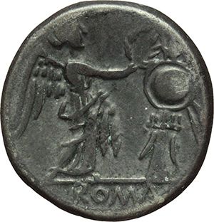 Roman Republican. 'L-T' series. Victoriatus, Luceria ca 214-212. Obv.: Laureate head of Jupiter right; below, L. Rev.: Victory crowning trophy; in centre field, MP. In exergue, ROMA. Syd. 132 var. Cr. 98A/1d. AG. g. 3.58 mm. 17.50 F+/VF. Repubblica Romana. Serie 'L-T'. Vittoriato, Luceria ca 214-212. D/ Testa laureata di Giove a destra; dietro, L. R/ Vittoria incorona un trofeo; nel campo al centro, MP. In esergo, ROMA. Syd. 132 var. Cr. 98A/1d. AG. g. 3.58 mm. 17.50 MB+/BB.