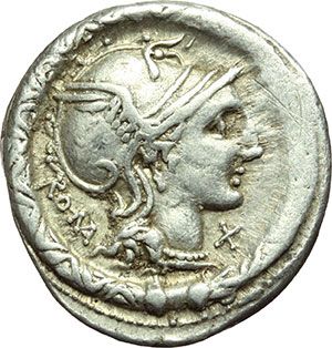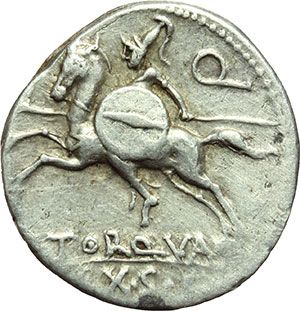 Roman Republican. L. Torquatus. Denarius, 113-112 BC. Obv.: Head of Roma right. X below chin. ROMA behind. All within decorated torque. Rev.: Soldier riding left. Q behind. [L] TORQVA below. In exergue: EX.S.C. Cr.295/1. B.(Manlia) 2. AG. g. 3.90 mm. 19.00 NC. About EF. Repubblica Romana. L. Torquatus. Denario, 113-112 a.C. D/ Testa di Roma a destra. Sotto il mento, X. Dietro, ROMA. Tutto entro torques decorato. R/ Guerriero che galoppa a sinistra. Dietro, Q. Sotto, [L] TORQVA. In esergo: EX.S.C. Cr.295/1. B.(Manlia) 2. AG. g. 3.90 mm. 19.00 NC. qSPL. Raro di questa qualità. Delicata patina di monetiere.