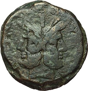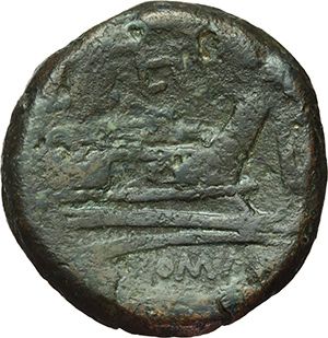 Roman Republican. 'LPLH' series. As, ca 194-190. Obv.: Laureate head of Janus, above mark of value I. Rev.: Prow right; above LPLH, before mark of value. Below, ROMA. B. Plautia 3. Syd 333. Cr. 134/2. AE. g. 42.46 mm. 34.00 R. About VF. Repubblica Romana. Serie 'LPLH'. Asse, ca 194-190. D/ Testa Giano laureata, sopra segno di valore I. R/ Prua a destra; sopra LPLH, davanti segno di valore. Sotto, ROMA. B. Plautia 3. Syd 333. Cr. 134/2. AE. g. 42.46 mm. 34.00 R. qBB.