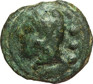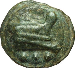 Roman Republican. Libral standard. Janus/Prow right series. Quadrans, 225-217 BC. Obv.: Head of Herakles left. Three pellets behind. Rev.: Prow right. Three pellets below. Cr. 35/4. AE. g. 70.70 mm. 43.00 Green patina. Good VF+. Repubblica Romana. Serie librale Giano/Prua a destra. Quadrante, 225-217 a.C. D/ Testa di Eracle a sinistra. Dietro, tre globetti. R/ Prua a destra. Sotto, tre globetti. Cr. 35/4. AE. g. 70.70 mm. 43.00 Patina verde. Bel BB+.
