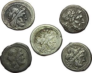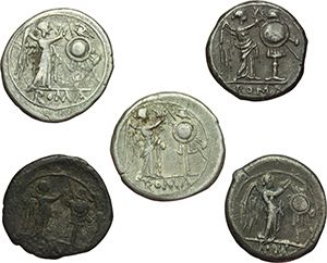 Roman Republican. Lot of 5 Victoriati, ca after 218. Obv.: Laureate head of Jupiter r.ight. Rev.: Victory right, crowning trophy. In exergue, ROMA. Cr. 44/1. AG. F+- VF+. Repubblica Romana. Lotto di 5 Vittoriati, ca dopo il 218. D/ Testa laureata di Giove a destra. R/ Vittoria a destra; incorona un trofeo. In esergo, ROMA. Cr. 44/1. AG. MB+-BB+.