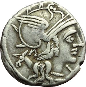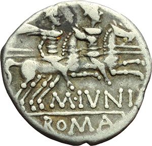Roman Republican. M. Junius. Denarius, ca 141. Obv.: Helmeted head of Roma right; behind, X. Rev.: The Dioscuri galloping r.; below, M IVNI. In exergue, ROMA. B. Junia 8. Syd. 408. Cr. 220/1. AG. g. 3.65 mm. 17.50 About VF. Repubblica Romana. M. Junius. Denario, ca 141. D/ Testa elmata di Roma a destra; dietro, X. R/ I Dioscuri al galoppo a destra, sotto M.IVNI. In esergo, ROMA. B. Junia 8. Syd. 408. Cr. 220/1. AG. g. 3.65 mm. 17.50 qBB.