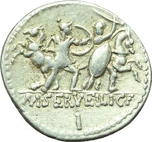Roman Republican. M. Servilius C.f. Denarius, 100 BC. Obv.: Head of Roma right. ? behind. Rev.: Two warriors, a Roman and a barbarian, fighting, each with horse behind. In exergue: M. SERVEILI. C.F. I below. Cr.327/1. B.13. AG. g. 3.86 mm. 21.50 About EF. Repubblica Romana. M. Servilius C.f. Denario, 100 a.C. D/ Testa di Roma a destra. Dietro, ?. R/ Un guerriero romano ed uno barbaro che combattono, armati di spade e scudi. Dietro ciascuno, un cavallo impennato. In esergo: M. SERVEILI. C.F. Sotto, lettera I. Cr.327/1. B.13. AG. g. 3.86 mm. 21.50 qSPL.