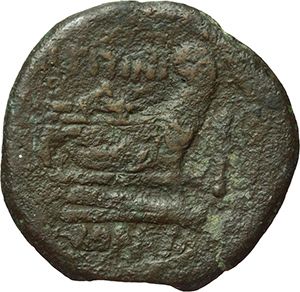Roman Republican. M. Titinius. As, ca 189-180. Obv.: Laureate head of Janus; above mark of value I. Rev.: Prow right; above M.TITINI, before mark of value and below, ROMA. B. Titinia 1. Syd 365. Cr. 150/1. AE. g. 29.32 mm. 31.80 F+. Repubblica Romana. M. Titinius. Asse, ca 189-180. D/ Testa di Giano laureata, sopra segno di valore I. R/ Prua a destra; sopra M.TITINI, davanti segno di valore I e sotto, ROMA. B. Titinia 1. Syd 365. Cr. 150/1. AE. g. 29.32 mm. 31.80 MB+.