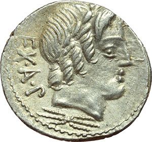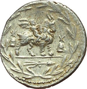 Roman Republican. Mn. Fonteius C.f. Denarius, 85 BC. Obv.: Laureate head of Vejovis right. EX.A.P (Ex Argento Publico) behind. Thunderbolt below. Rev.: Young Genius on standing goat right. Caps of the Dioscuri to left and to right. Thyrsus in exergue. All within laurel-wreath. Cr.353/2. B.12. AG. g. 3.88 mm. 18.50 R. EF. Rare. Repubblica Romana. Mn. Fonteius C. f. Denario, 85 a.C. D/ Testa laureata di Vejovis a destra. Dietro, EX.A.P (Ex Argento Publico). Sotto, fulmine. R/ Genio infante alato su capra stante a destra. A destra e a sinistra, i cappelli dei Dioscuri. In esergo: tyrso. Tutto entro corona di lauro. Cr.353/2. B.12. AG. g. 3.88 mm. 18.50 R. SPL. Raro.