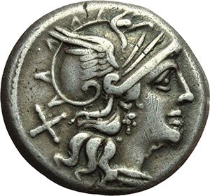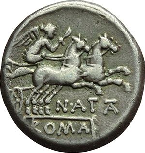 Roman Republican. Pinarius Natta. Denarius, ca 149. Obv.: Helmeted head of Roma right; behind, X. Rev.: Victory in biga prancing right; below, NATTA and ROMA. B. Pinaria 1. Syd. 390. Cr. 208/1. AG. g. 4.54 mm. 18.50 VF. Repubblica Romana. Pinarius Natta. Denario, ca 149. D/ Testa elmata di Roma a destra; dietro X. R/ Vittoria su biga a destra; sotto, NATTA e ROMA. B. Pinaria 1. Syd. 390. Cr. 208/1. AG. g. 4.54 mm. 18.50 BB.