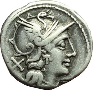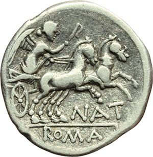 Roman Republican. Pinarius Natta. Denarius, ca 155. Obv.: Helmeted head of Roma right; behind, X. Rev.: The Dioscuri galloping right; below, NAT. In exergue, ROMA. B. Pinaria 2. Syd. 382. Cr. 200/1. AG. g. 3.47 mm. 18.50 VF. Repubblica Romana. Pinarius Natta. Denario, ca 155. D/ Testa elmata di Roma a destra; dietro X. R/ I Dioscuri al galoppo a destra; sotto NAT. In esergo, ROMA. B. Pinaria 2. Syd. 382. Cr. 200/1. AG. g. 3.47 mm. 18.50 BB.