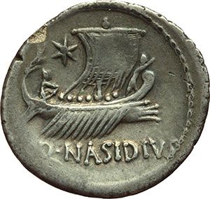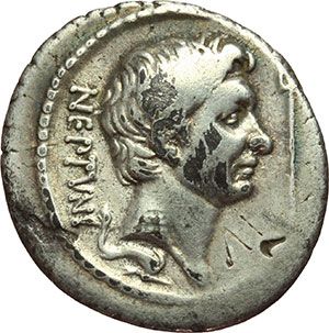 Roman Republican. Pompeius Magnus. Denarius, struck under Sextus Pompey. Massilia, 42-38 BC. Q. Nasidius praefectus classis. Obv.: Bare head of Pompeius Magnus right. NEPTVNI behind. Trident before. Dolphin below. Rev.: Galley with bank of rowers right. Helmsman steering rudder. Hortator standing on prow. Star above. Q. NASIDIVS below. Cr.483/2. B.28. AG. g. 3.63 mm. 19.00 RR. VF. Repubblica Romana. Pompeo Magno. Denario, emesso da Sesto Pompeo. Massilia, 42-38 a.C. Q. Nasidius praefectus classis. D/ Testa nuda di Pompeo Magno a destra. Dietro, NEPTVNI. Davanti, tridente. Sotto, delfino. R/ Galera che naviga a destra. Sul ponte, visibili le teste di sette rematori; a poppa il timoniere e a prua l'hortator. Sopra, stella. Sotto, Q. NASIDIVS. Cr.483/2. B.28. AG. g. 3.63 mm. 19.00 RR. BB.