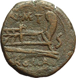 Roman Republican. Q. Caecilius Metellus. Semis, ca 130 B.C. Obv.: Laureate head of Saturn right; behind S. Rev.: Prow right; above Q.METE, before S. Below, ROMA. B. Caecilia 22. Syd. 510. Cr. 256/2a. AE. g. 10.42 mm. 22.00 Good VF. Repubblica Romana. Q. Caecilius Metellus. Semisse, ca 130 a.C. D/ Testa laureata di Saturno a destra; dietro, S. R/ Prua a destra; sopra Q.METE, davanti S. Sotto, ROMA. B. Caecilia 22. Syd. 510. Cr. 256/2a. AE. g. 10.42 mm. 22.00 BB+.