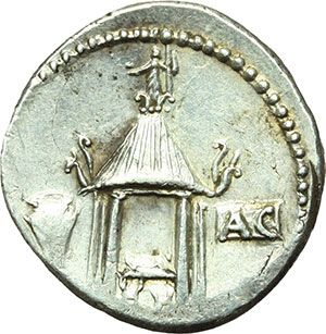 Roman Republican. Q. Cassius Longinus. Denarius, 55 BC. Obv.: Head of Libertas right. LIBERT behind. Q. CASSIVS before. Rev.: Temple of Vesta. Curule chair within. Urn to left. Voting tablet inscribed AC (Absolvo/ Condemno) to right. Cr.428/2. B.8. AG. g. 3.91 R. EF. Rare. Bright surfaces. Repubblica Romana. Q. Cassius Longinus. Denario, 55 a.C. D/ Testa di Libertas a destra. Dietro, LIBERT. Davanti, Q. CASSIVS. R/ Il tempio di Vesta. All'interno, sedia curule. A sinistra, urna. A destra, tavoletta di voto con iscrizione AC (Absolvo/ Condemno). Cr.428/2. B.8. AG. g. 3.91 R. Marginale circoscritta debolezza di conio in ore 8 del R/, altrimenti SPL. Raro. Fondi lucenti.