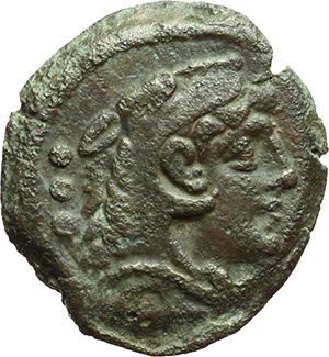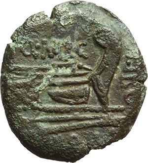 Roman Republican. Q. Marcius Libo. Quadrans, ca 148 B.C. Obv.: Head of Hercules right, wearing lion skin, behind three pellets. Rev.: Prow right; above, Q.MARC, before LIBO. Below, ROMA. B. Marcia 5. Syd. 396e. Cr. 215/5. AE. g. 6.54 mm. 19.00 R. Good VF. Repubblica Romana. Q. Marcius Libo. Quadrante, ca 148 a.C. D/ Testa di Ercole a destra con pelle di leone, dietro tre globetti. R/ Prua a destra; sopra Q.MARC, davanti LIBO. Sotto, ROMA. B. Marcia 5. Syd. 396e. Cr. 215/5. AE. g. 6.54 mm. 19.00 R. BB+.