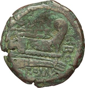 Roman Republican. Q. Marcius Libo. Semis, ca 148. Obv.: Laureate head of Saturn right, behid S. Rev.: Prow right; above Q.MARC, before LIBO. Below, ROMA. B. Marcia 3. Syd 396c. Cr. 215/3. AE. g. 14.53 mm. 26.00 NC. Nice brown patina. VF. Repubblica Romana. Q. Marcius Libo. Semisse, ca 148. D/ Testa di Saturno laureata a destra, dietro S. R/ Prua a destra; sopra Q.MARC, davanti LIBO. Sotto, ROMA. B. Marcia 3. Syd 396c. Cr. 215/3. AE. g. 14.53 mm. 26.00 NC. Bella patina marrone BB.