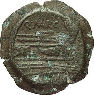 Roman Republican. Q. Marcius Libo. Triens, ca 148. Obv.: Helmeted head of Minerva right, behind four pellets. Rev.: Prow right; above Q.MARC, before LIBO. Below, ROMA. B. Marcia 4. Syd. 396d. Cr. 215/4. AE. g. 7.94 mm. 21.00 NC. VF/Good FV. Repubblica Romana. Q. Marcius Libo. Triente, ca 148. D/ Testa di Minerva elmata a destra, dietro quattro globetti. R/ Prua a destra; sopra Q.MARC, davanti LIBO. Sotto, ROMA. B. Marcia 4. Syd. 396d. Cr. 215/4. AE. g. 7.94 mm. 21.00 NC. BB/BB+.