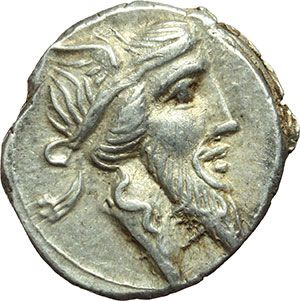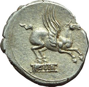Roman Republican. Q. Titius. Denarius, 90 BC. Obv.: Head of Mutinus Titinus right, wearing winged diadem. Rev.: Pegasos right on tablet inscribed Q. TITI. Cr. 341/1. B.1. AG. g. 3.79 mm. 18.00 EF. A very attractive coin. Repubblica Romana. Q. Titius. Denario, 90 a.C. D/ Testa di Mutinus Titinus (Priapo) a destra, che indossa diadema alato. R/ Pegaso a destra. Sotto,Q. TITI in tavoletta. Cr. 341/1. B.1. AG. g. 3.79 mm. 18.00 SPL. Un esemplare molto attraente.