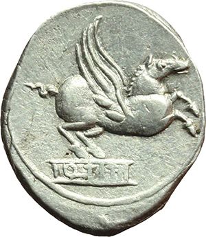 Roman Republican. Q. Titius. Denarius, ca 90. Obv.: Head of Mutinus Titinus right, wearing winged diadem. Rev.: Pegasus prancing r.; below, Q·TITI in linear frame. B. Titia 1. Syd. 691. Cr. 341/1. AG. g. 3.76 mm. 17.00 Good VF. Repubblica Romana. Q. Titius. Denario, ca 90. D/ Testa di Mutinus Titinus a destra, con diadema alato. R/ Pegaso al galoppo a destra; sotto Q.TITI. B. Titia 1. Syd. 691. Cr. 341/1. AG. g. 3.76 mm. 17.00 BB+.