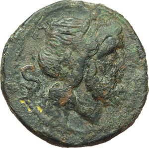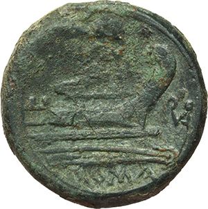 Roman Republican. 'ROMA in monogram' series. Semis, South East Italy ca 211-210. Obv.: Laureate head of Saturn right, behid S. Rev.: Prow right; above S, before ROMA in monogram. Below, ROMA. Syd. 190a. Cr. 84/5. AE. g. 20.05 mm. 28.00 R. Good VF. Repubblica Romana. Serie 'ROMA in monogramma'. Semisse, Italia sud-orientale ca 211-210. D/ Testa di Saturno laureata a destra, dietro S. R/ Prua a destra; sopra S, davanti ROMA in monogramma. Sotto, ROMA. Syd. 190a. Cr. 84/5. AE. g. 20.05 mm. 28.00 R. BB+.