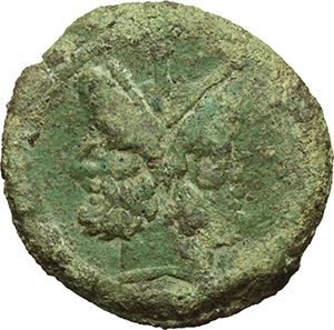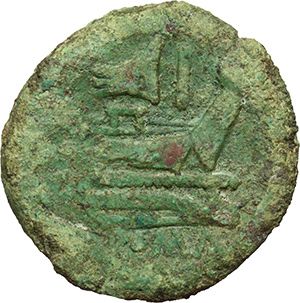 Roman Republican. 'Rostrum tridens' series. As, ca 206-195. Obv.: Laureate head of Janus; above, mark of value I. Rev.: Prow right; above, rostrum tridens and mark of value. Below, ROMA. Syd. 245. Cr. 114/2. AE. g. 32.31 mm. 35.50 VF. Lovely light green patina. Repubblica Romana. Serie 'rostrum tridens'. Asse, ca 206-195. D/ Testa laureata di Giano, sopra segno di valore I. R/ Prua a destra; sopra rostrum tridens e segno di valore. Sotto, ROMA. Syd. 245. Cr. 114/2. AE. g. 32.31 mm. 35.50 BB. Bella patina verde chiaro.